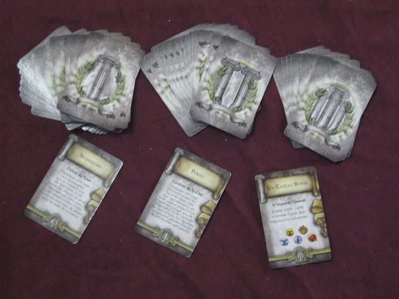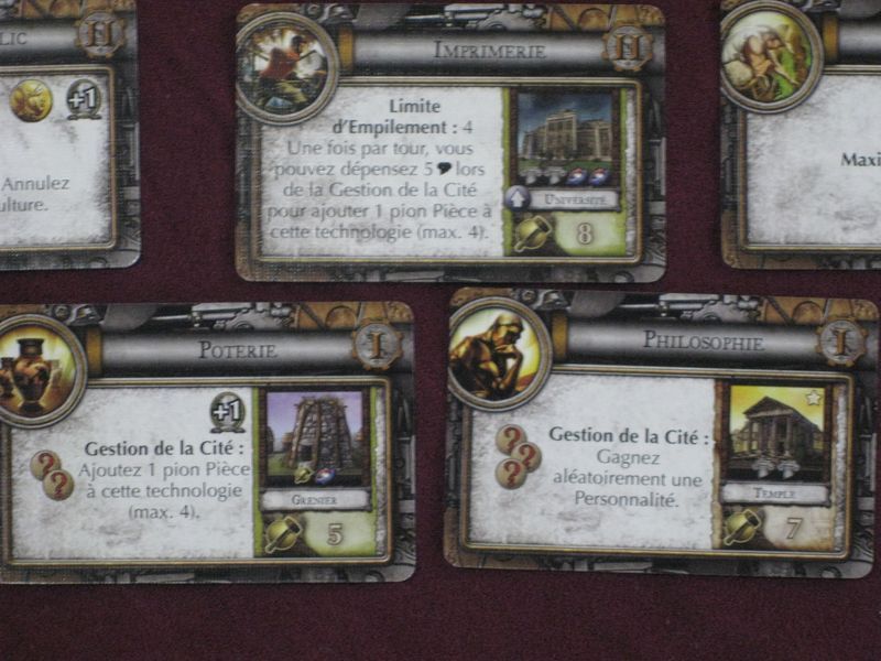 Il y en a bien moins que dans le jeu vidéo, mais il ne faudra pas les négliger. Ce sont eux qui vont permettent d'avancer. Certains amélioreront la construction, d'autre la culture ou bien encore l'économie. Il y en a pour toutes les stratégies et pour tous les goûts! Mais attention, ils sont en nombres très limités !