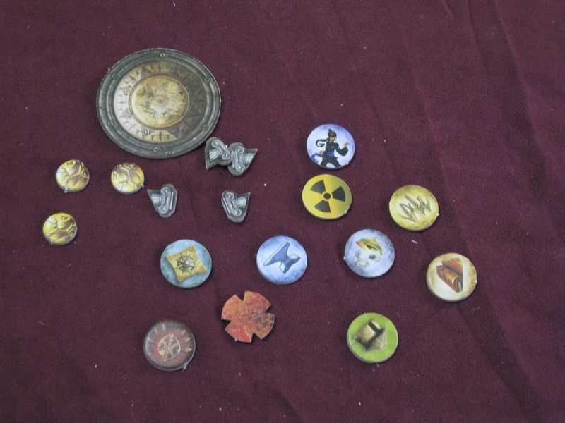 Les 8 pièces en plastique, les marqueurs pour les villes ou le niveau des unités et les différentes technologies que sa civilisation a développées.