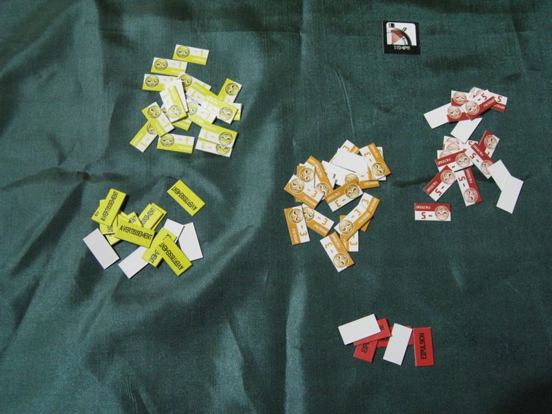 Mais ils sont bien là nos cartons. Sous forme de marqueurs. C'est un peu le défaut du jeu ces marqueurs, ils sont petits, mais surtout une des face est blanche.