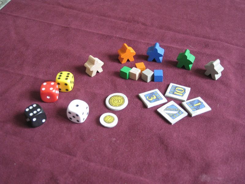 On remarque les 4 différentes couleurs de dés, ainsi que des pions pour 5 joueurs... 5 !!! Mais c'est noté 4 sur la boîte ??? On m'aurait menti !