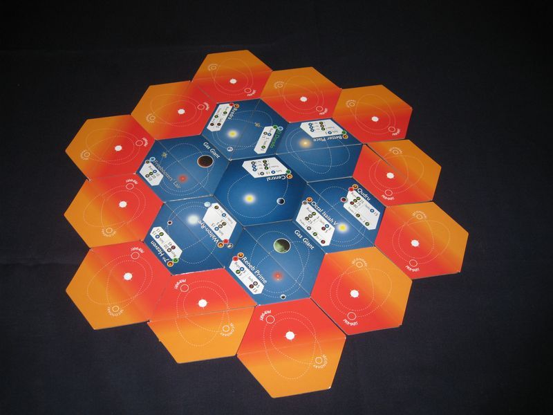 Le plateau est constitué d'un hexagone central qui sera le point de départ des joueurs. Les autres hexagones sont des "demis-hexagones" qu'on reconstitue. Chaque hexagone correspond à un système solaire à visiter.
