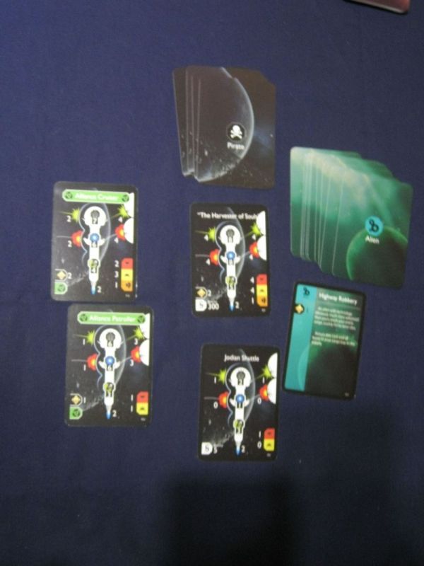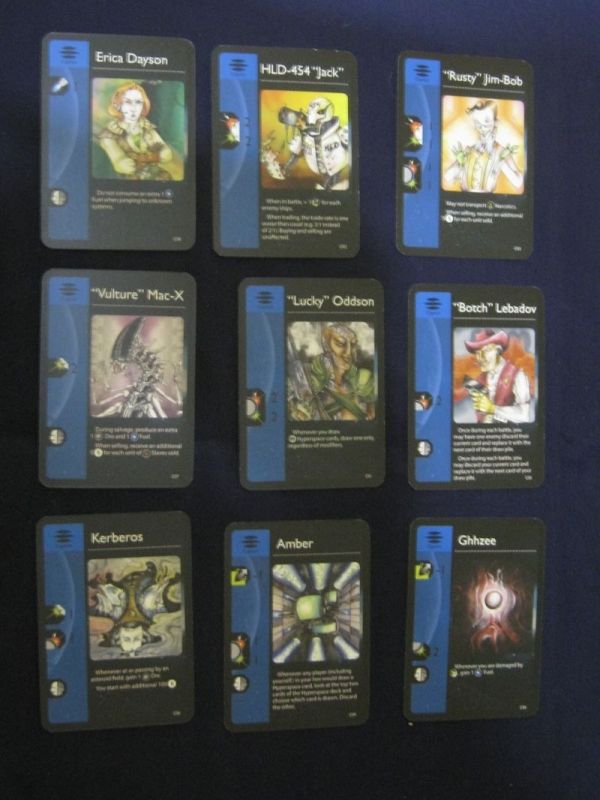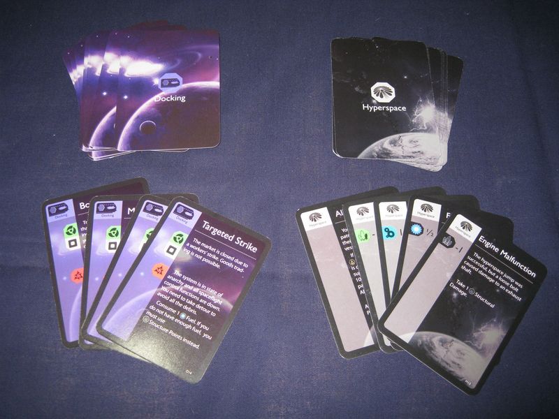 En violet, ce sont les cartes "docks". Parce que les problèmes n'ont pas lieux que dans l'espace, mais aussi sur les planètes ou stations spatiales. Ces cartes peuvent être de simples révoltes qui bloquent les docks, mais aussi des contrôles de police ou des débarquements de pirates. Les effets changent en fonction de la réputation du capitaine.