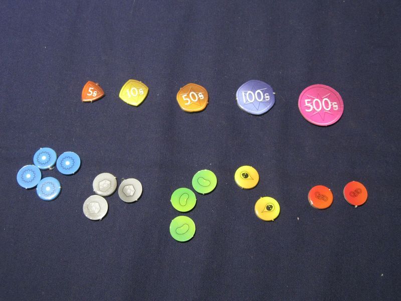 Comme c'est un jeu de commerce, entre autre, il faut bien symboliser l'argent par quelque chose. Voici dont en haut de cette photo, les pièces.