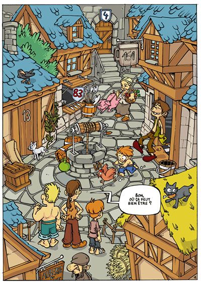 Après cinq pages nous permettant d'entrer dans l'univers médiéval qui nous est ici proposé, on arrive en ville, dans une pleine page et des premiers choix s'offrent à nous : des chiffres, incrustés dans le décor, nous invitent à faire notre choix et à vivre notre propre aventure.