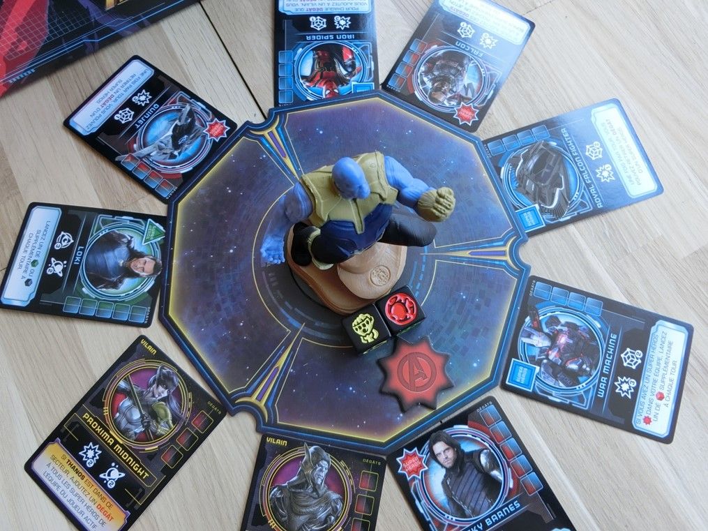 On trouve une figurine de Thanos, des cartes avec les illustrations des protagonistes des films Marvel, des pions plastique et carton et des dés, éléments essentiels d'un dice building.