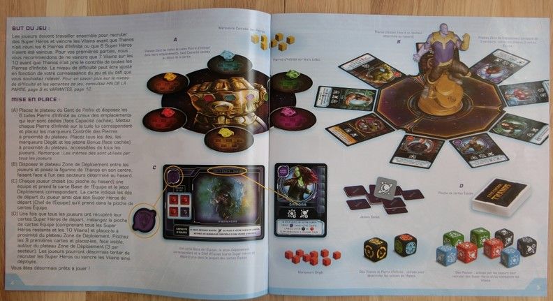 Le jeu reprend l'univers filmographique de Marvel. Les joueurs vont s'entraider pour recruter une équipe de super héros pour combattre Thanos et ses sbires. Il faudra arriver à les vaincre avant que celui-ci ne récupère toutes les pierres d'infinité. Chaque héros recruté viendra en aide à votre équipe et ajoutera une capacité à vos lancers de dés. Les joueurs devront faire preuve de communication pour venir à bout de Thanos.