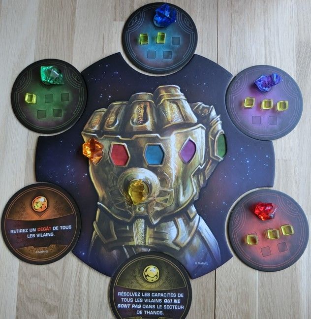 5/ Pour chaque héros sauvé, sbires vaincus ou héros au centre de la table tués par Thanos on replace une nouvelle carte. Puis on vérifie les conditions de fin.
