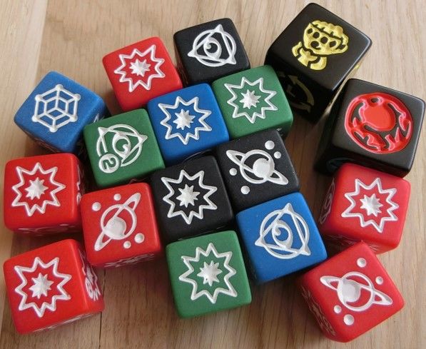 3/ On lance nos dés, 4 au début, puis de plus en plus au cours d'une partie. Il y a 4 symboles sur les dés joueurs et donc selon la couleur d'un dé les symboles se dupliquent. A chaque lancer, on est obligé d'assigner au moins un dé à l'une des trois cartes de l'emplacement sélectionné. S’il nous reste des dés non affectés, on les relance et ainsi de suite.