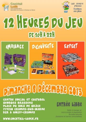 12 heures consacrées aux jeux de société "nouvelle génération" qui se tiendront le dimanche 8 décembre 2013 de 10h à 22h.