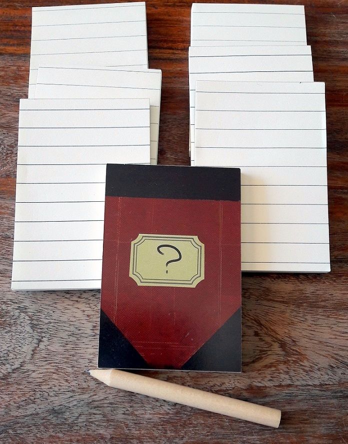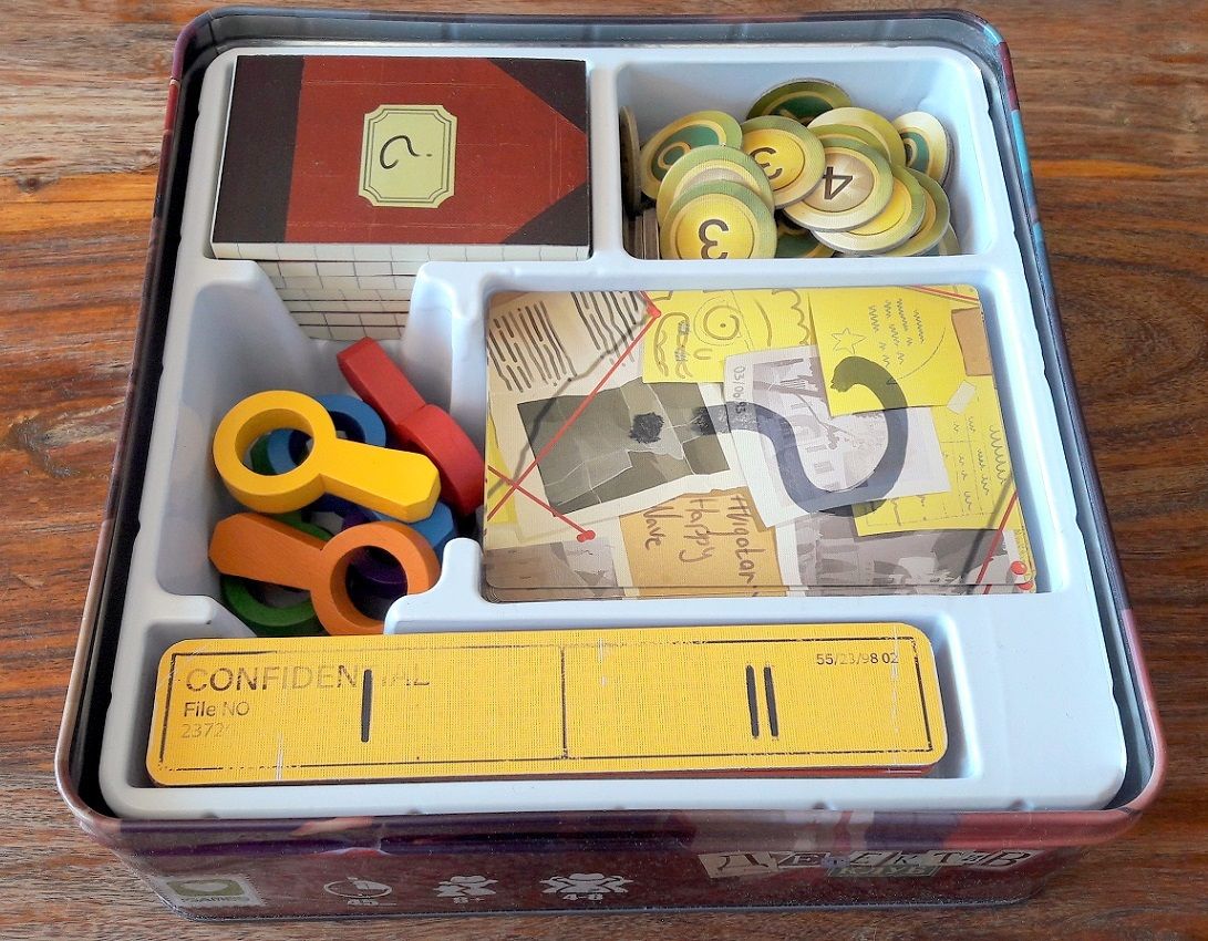 Chaque joueur (je rappelle que le jeu se joue jusqu'à 8 joueurs !) aura à sa disposition une petit tuile rappelant sa couleur et l'ordre de pose des 2 cartes jouées dans chaque manche, un pion loupe en bois à sa couleur d'une taille autant indécente qu'inutile et agréable, et enfin un calepin sur lequel on pourra lire (ou pas) le thème de la manche. Un crayon gris et de petits jetons de score (3/4/5 points) viendront compléter le tableau. Il est à noter que le thermoformage est très bien pensé mais ne permettra pas de voir arriver d'extension(s) sans devoir s'en débarrasser ! Je signale également l'existence d'un application smartphone bien pensée permettant de se passer des calepins et du crayon et de gagner ainsi un peu de temps lors de chaque manche.