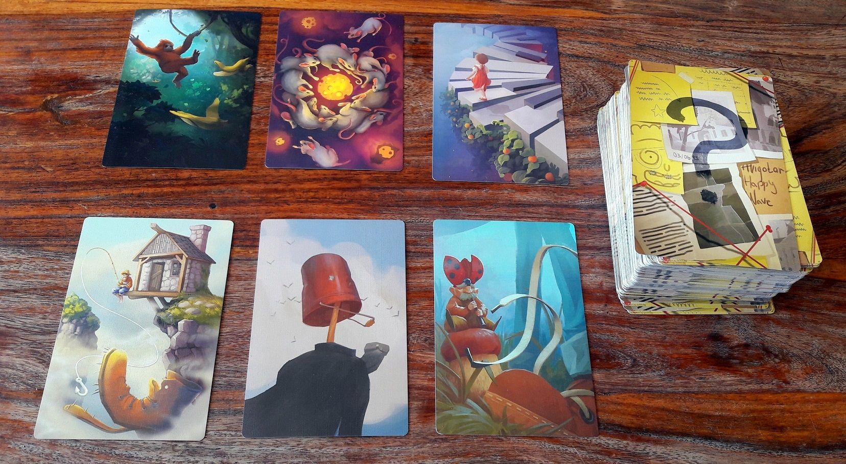 En effet, on va retrouver 160 cartes de type Dixit représentant chacune une véritable oeuvre d'art avec moults détails et plusieurs niveaux de lecture, permettant un grand nombre d'interprétations... mais ce n'est pas tout !