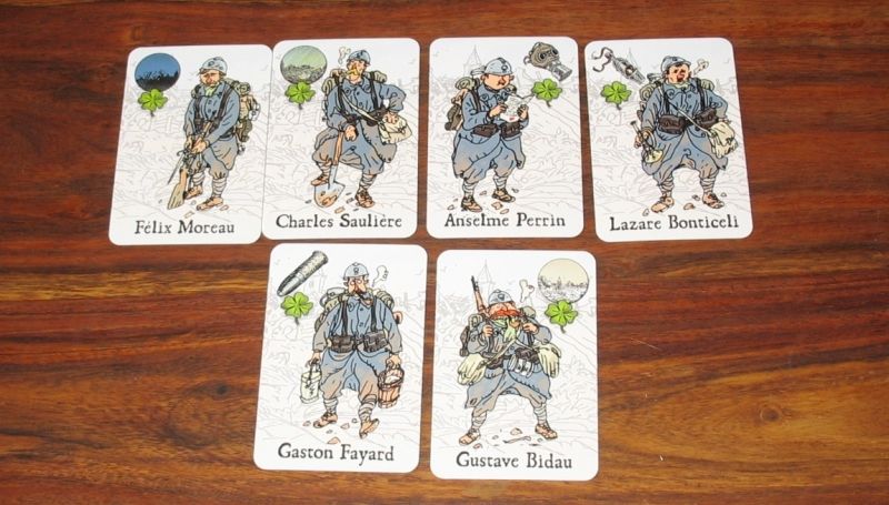 Les cartes épreuves sont de 2 types : coups durs qui vont handicaper un soldat, ou menaces (plusieurs parmi 6 possibles : la pluie, la neige, la nuit, l'obus (bombardement), le sifflet (attaque), le masque (gaz)).