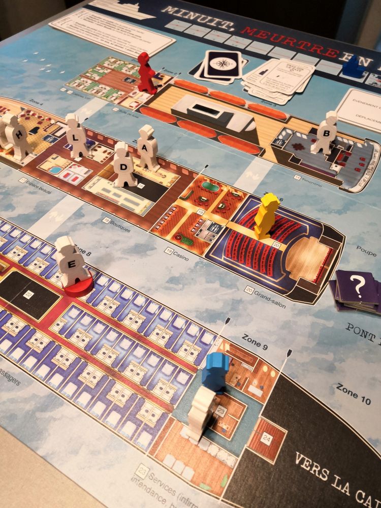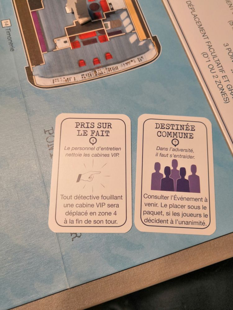 Donc c'est fini, ce dé à 10 faces reste dans la boite. Le commissaire de bord ( le pion rouge ) se déplace désormais grâce aux cartes évènements. Le symbole connu de localisation permet de savoir dans quelle salle ira ce commissare pour nous empêcher d'enquêter. Pas de grand changement, juste le hasard des cartes. Mais désormais, pour un point d'action, vous pourrez dire à ce commissaire d'aller voir au piano-bar si on y est. Bonne nouvelle !