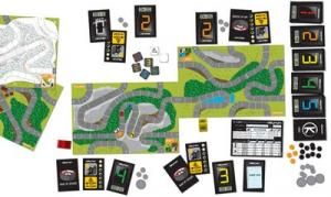 L'ouverture consommée, pas de casques ou de gants mais 4 plateaux, un carnet de feuilles P.C course, des cartes de vitesse et de «korde» (non, pas de faute: il s'agit bien d'un "K" dans ce jeu), des dés de vitesses noirs et 2 dés de gaz blancs, un panneau de départ et d'arrivée et un sachet de jetons, le tout accompagné d'un livret de règles. Et puisqu'il s'agit de rallye, ici 4 MRC (pour Micro Rally Car) vous serviront de véhicules.