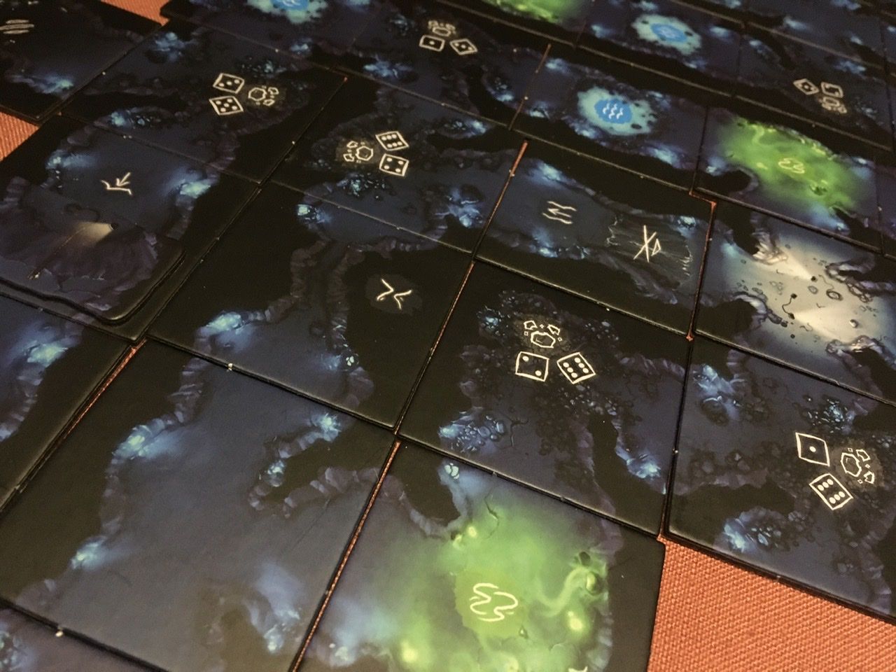 La version Kickstarter du jeu en anglais offrait également un traitement UV fluorescent aux tuiles, afin de pouvoir jouer dans le noir sous une lampe UV. Je n’ai pas pu déterminer si la version française permettait également le faire n’ayant pas de lampe UV à la maison. En tout cas ça n’a pas du tout été indiqué sur les caractéristiques du jeu, donc on peut penser que c’était un petit twist exclusif au Kickstarter.