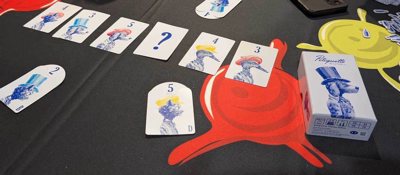 Vous faites face à une ligne de cartes représentant des animaux (chiens, chats, oiseaux) portant différents chapeaux et associés à des chiffres. Une place est vide. Votre but ? Trouver la carte qui s'insère le plus "naturellement" dans cette suite. Il n'y a pas de règle mathématique absolue : le but est de choisir la même carte que les autres joueurs en devinant leur sens logique.