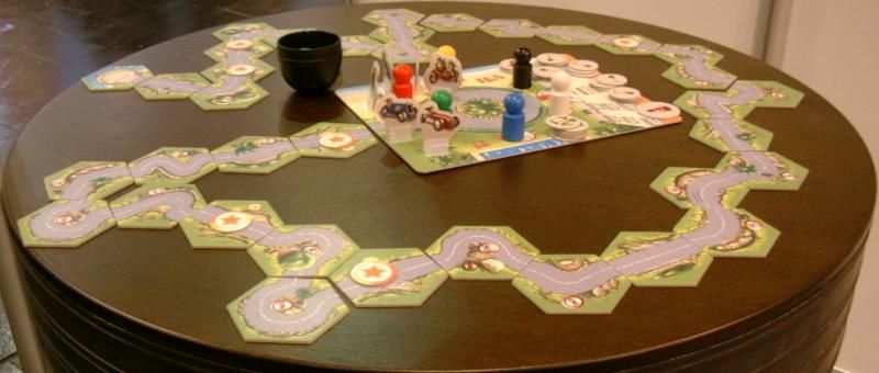 Le soir à l'auberge, tout d'abord une partie de Leader 1 qui simule une course cycliste. Décidément, on reste dans le domaine du sport, mais cette fois je n'aurai pas trop de mal à m'immerger dans la thématique. D'après les autres joueurs, plus connaisseurs que moi en la matière, le thème est vraiment bien rendu. Malgré mon ignorance relative dans ce domaine, j'ai moi aussi apprécié la partie.