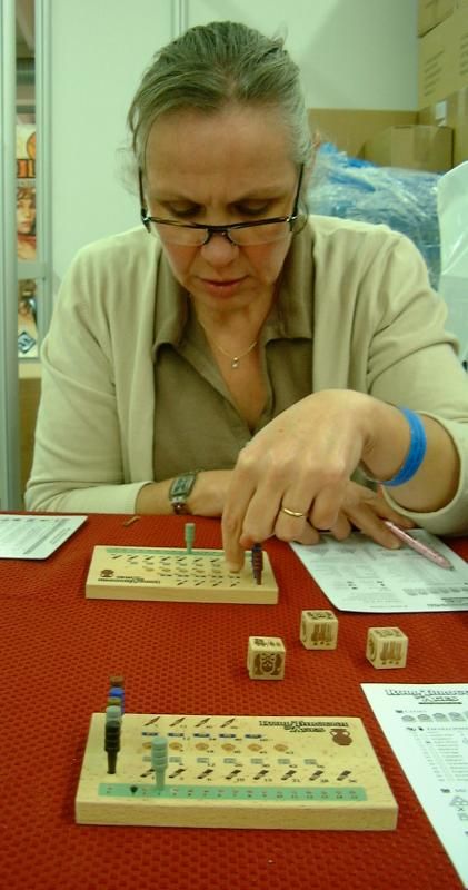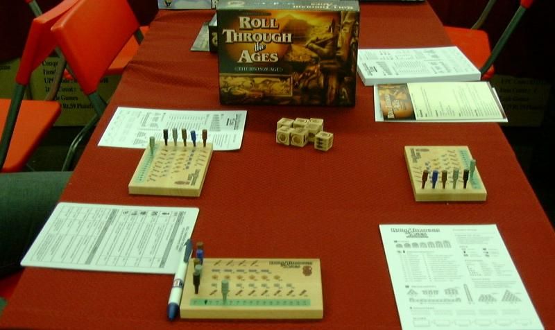 On trouve un peu par hasard une boîte de Roll Through the Ages, le nouveau jeu de Matt Leacock (l'auteur de Pandemic) et après lecture de la règle en anglais, on se lance dans une partie que l'on devra abandonner avant la fin, pour cause de rendez-vous des joueurs francophones, mais qui était bien avancée quand même. Le jeu au superbe matériel en bois nous a laissé une bonne impression.