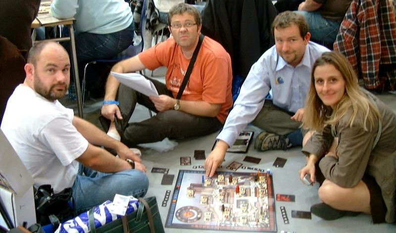 On poursuit notre visite du salon et on entame une partie de Der Name der Rose à même le sol. Explication de règles laborieuse à l'appui, on démarre la partie mais on abandonnera assez vite, le jeu ne nous ayant pas convaincus. D'autres ont apprécié leurs parties et je me dis qu'on a peut-être loupé quelque chose, mais en tout cas le jeu n'est pas à comparer aux deux premiers titres de l'auteur, à savoir Stefan Feld.