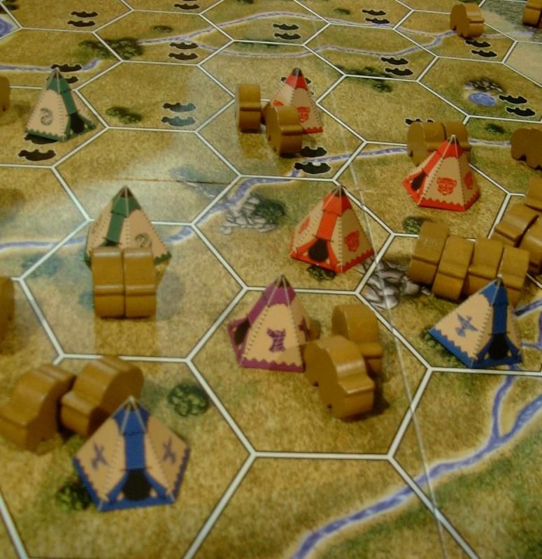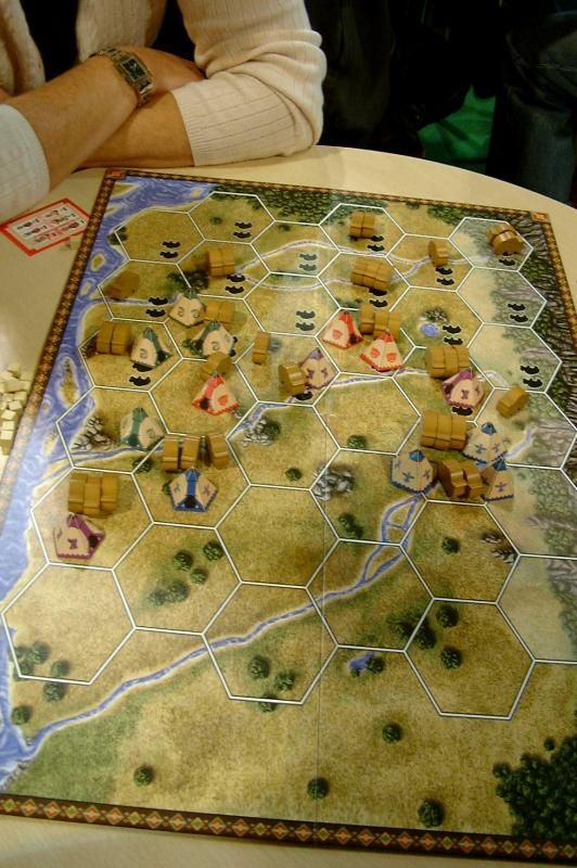 On poursuit par une partie de Wind River, un jeu que je n'avais pas du tout repéré dans le flot des sorties annoncées pour Essen. A première vue, c'est un jeu au matériel simple et beau (un plateau, des tipis, des buffles et quelques cubes en bois). Le but du jeu est de suivre avec ses tipis le déplacement des buffles vers l'est. Le thème est très bien rendu, mais un mauvais placement initial m'a fait passer à côté de la partie. A retester plus tard pour me faire une seconde opinion.