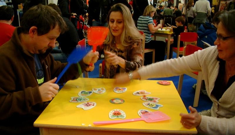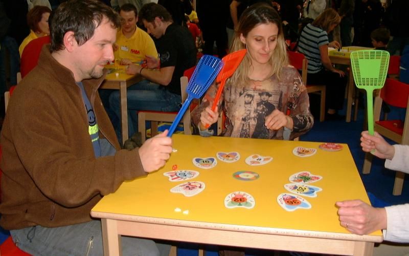 On passe ensuite par le stand de Haba où l'on s'attarde sur les jeux Kofferdetektive, un jeu d'observation où l'on doit essayer de retrouver à travers une vitre quels sont les objets qui ont été retirés, et 3.4 = Klatsch, un jeu sur les tables de multiplications où le but est de taper en premier sur le bon résultat avec sa tapette à mouches.