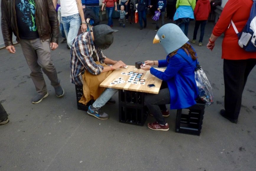 2 oiseaux qui jouent à un jeu de cartes entre 2 halls...
