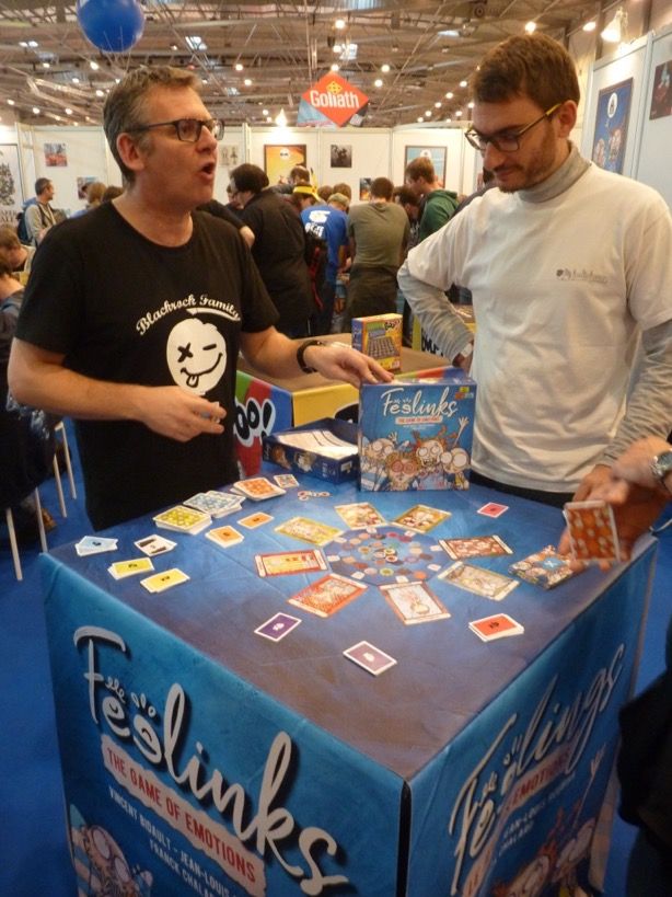 En attendant on profite de Vincent Bidault le co auteur du jeu Feelings avec Jean-Louis Roubira (le papa de Dixit) qui nous présente son jeu sur le stand d'Act In Games.