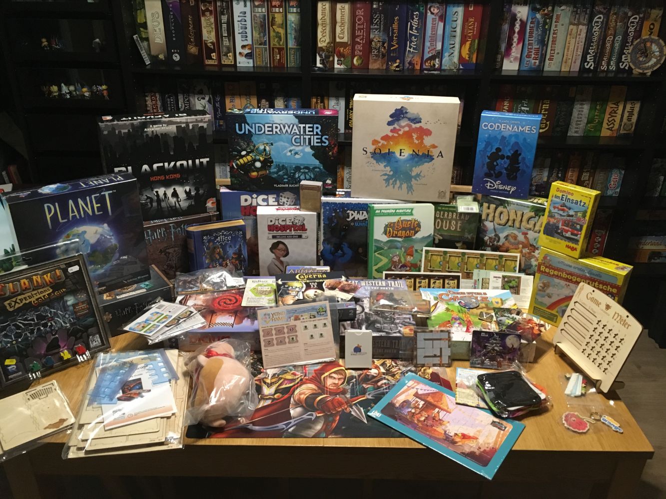 Et voici notre loot, après être rentré et avoir tout trié :) On retrouve sur la table, sans ordre précis : Blackout Hong Kong, Solenia, Harry Potter : Hogwarts Battle, Planet, Alice, Clank - Extension Gold and Silk, une tour à dé, un tapis de jeu pour Hero Realms, Alice, un insert pour Roll for the Galaxy, Dice Hospital, Underwater Cities, Once upon a Castle, Honga, Codename Disney, Gingerbread House, Dwar7's Winter, Caverna : Cave vs Cave Era II, Dicium, Great Wester Trail Extension, En quête du Dragon, une série de goodies, Domino Pin-Pon et Saute-Nuages.