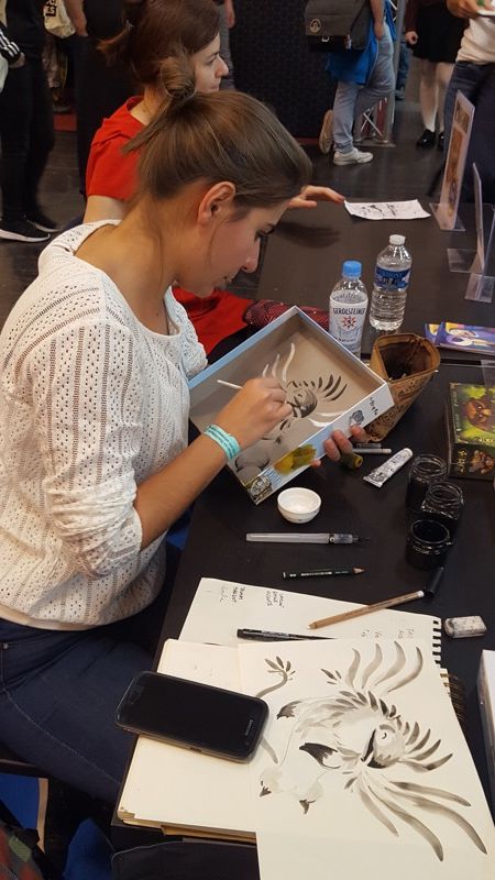 Et on retourne dans l'antre ludique. Chez Blackrock, on croise Camille Chaussy l'illustratrice (Jurassik Snak, Ice Team, Micropolis, Edenia, Grand Bois...) qui dédidace son dernier jeu l'Ile de Pan chez Lumberjacks Studio.