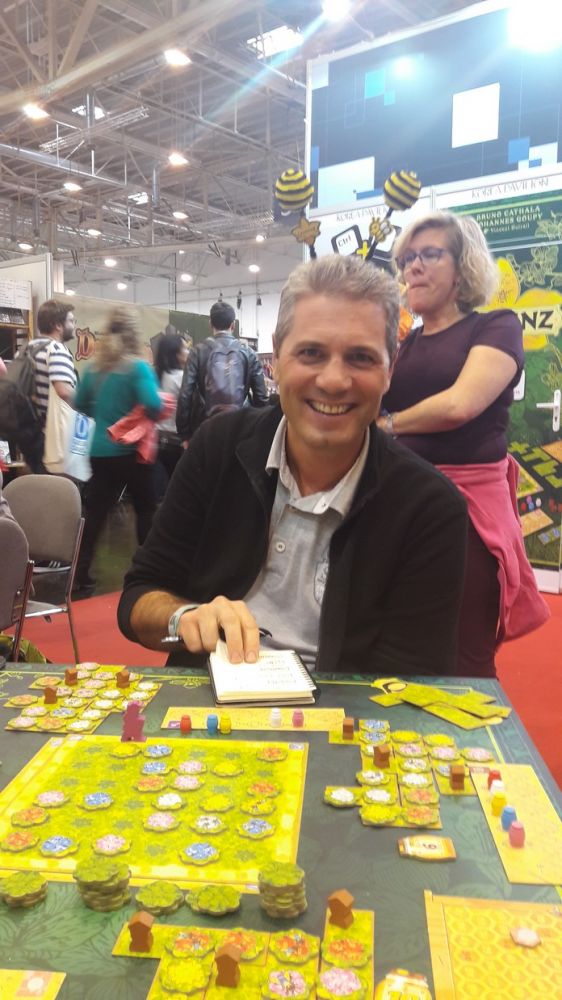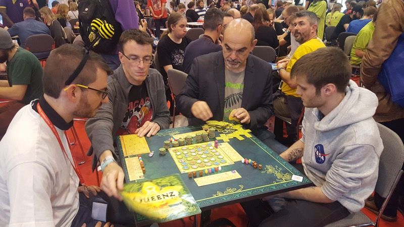 Malgré la fatigue, c'est encore avec beaucoup de gentillesse et de disponibilité que Bruno se met à nous expliquer son jeu Queenz (enfin moi je connaissais un peu... mais faut pas le dire).