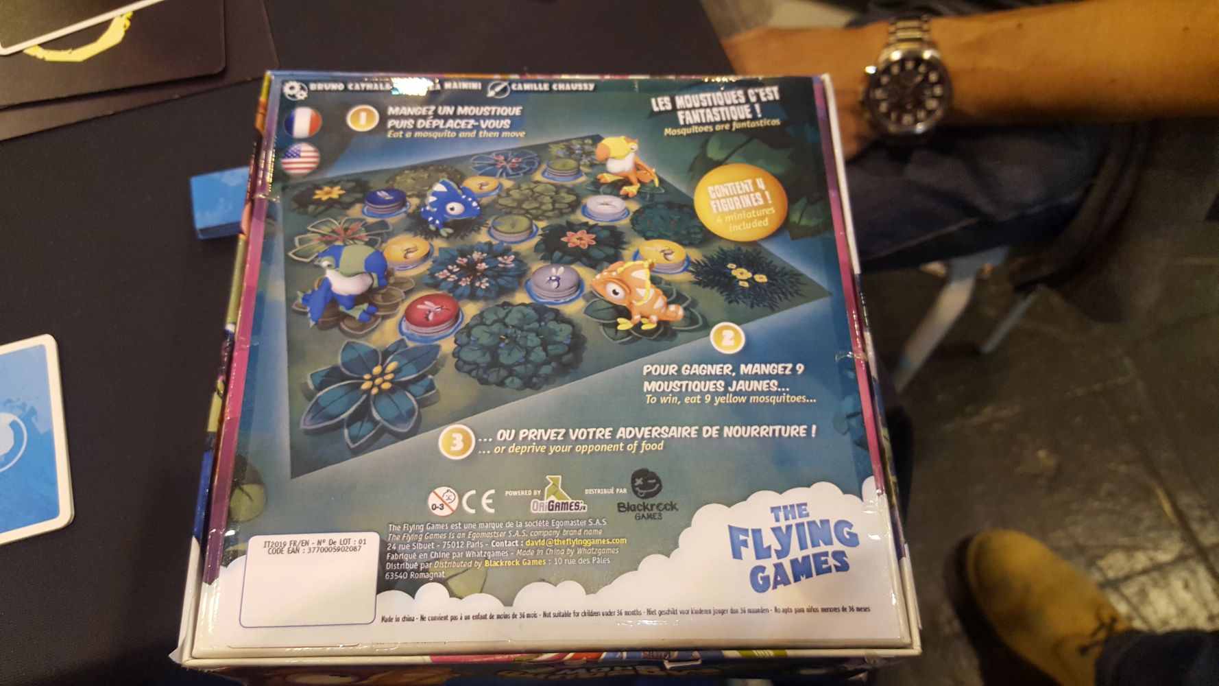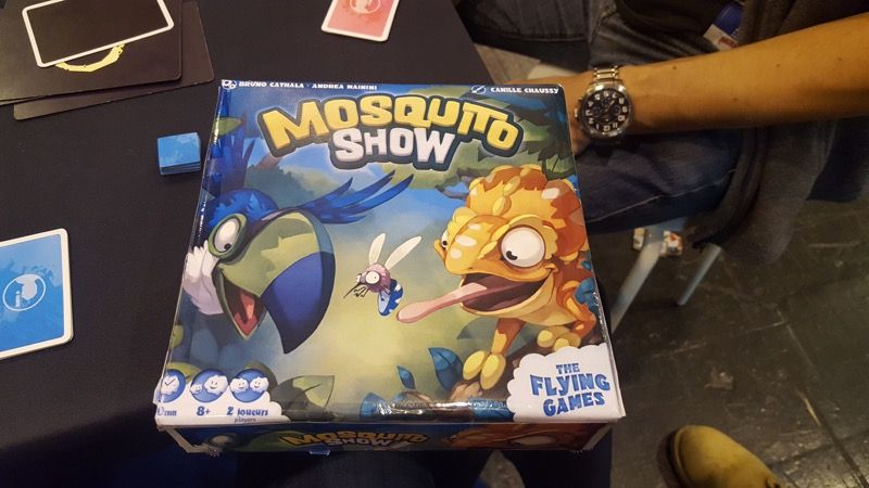 Pendant notre partie de Fellinks nous saluons David Perez le boss de The Flying Games qui passe à côté de notre table. On discute quelques minutes, et ni une ni deux, David nous sort la boite de Mosquito Show le prochain jeu de la gamme deux joueurs de Bruno Cathala et Andrea Mainini, toujours illustré par Camille Chaussy.