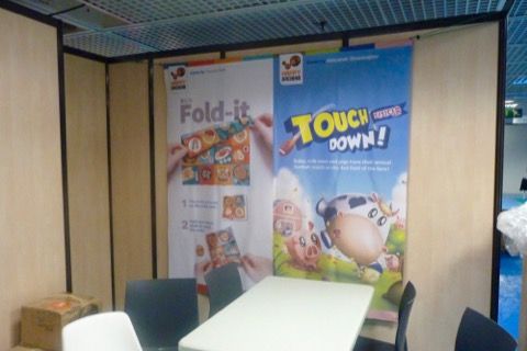 Beau stand pour une première avec des belles affiches et plein de tables...