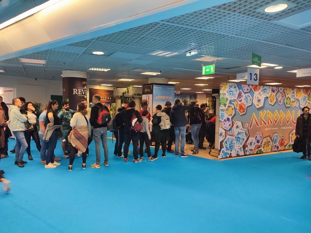 Le premier effet des remises des As d'Or. de la veille... il faut faire la queue dès 9h00 chez Gigamic pour espérer jouer à Akropolis l'As d'Or Tout Public 2023