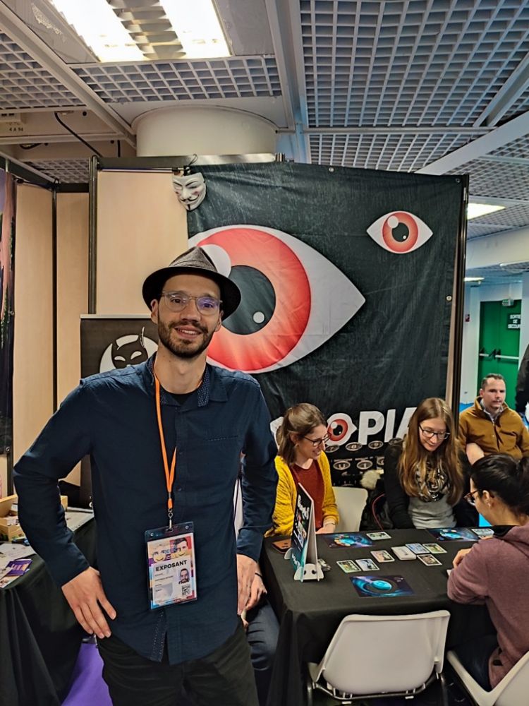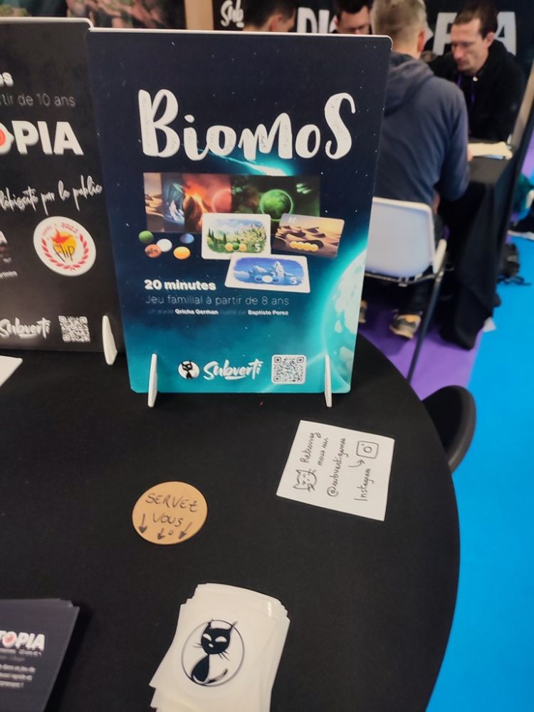 J'enchaine avec le stand de Subverti où l'éditeur met en avant son nouveau jeu Biomos qui arrive sur la plateforme participative Ulule. C'est un jeu familial de Gricha German illustré par Baptiste Perez.