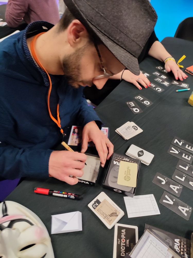 Mais c'est surtout Dictopia que je venais essayer moi qui adore les jeux de lettres ou de mots (contrairement à Cyril !!!). Je profite de la présence de l'auteur Jérémy Partinico sur le stand pour faire une explipartie avec lui.