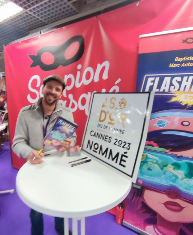 En passant devant le stand Scorpion Masqué, je félicite Baptiste Derrez (le passe-temps) l'un des coauteurs avec Marc-Antoine Doyon (Es-tu Game ?) de Flashback : Zombie Kidz pour son As d'Or jeu Enfant de la veille.
