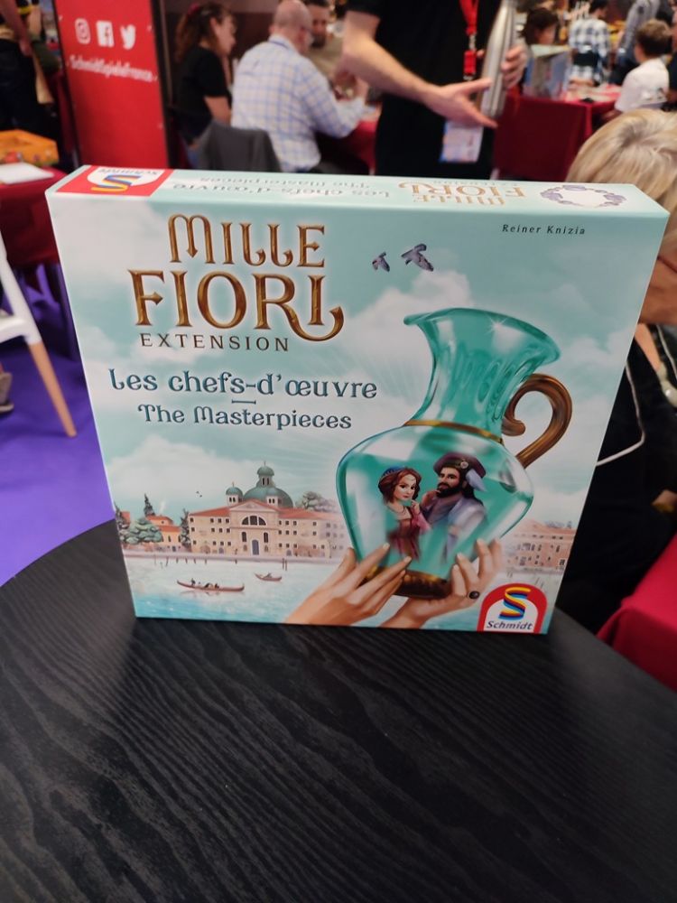 Avant la fin de la journée qui arrive je vais faire un tour chez l'éditeur allemand Schmidt pour voir le matériel des chefs-d'oeuvre l'extension de Mille Fiori le jeu de Reiner Knizia.