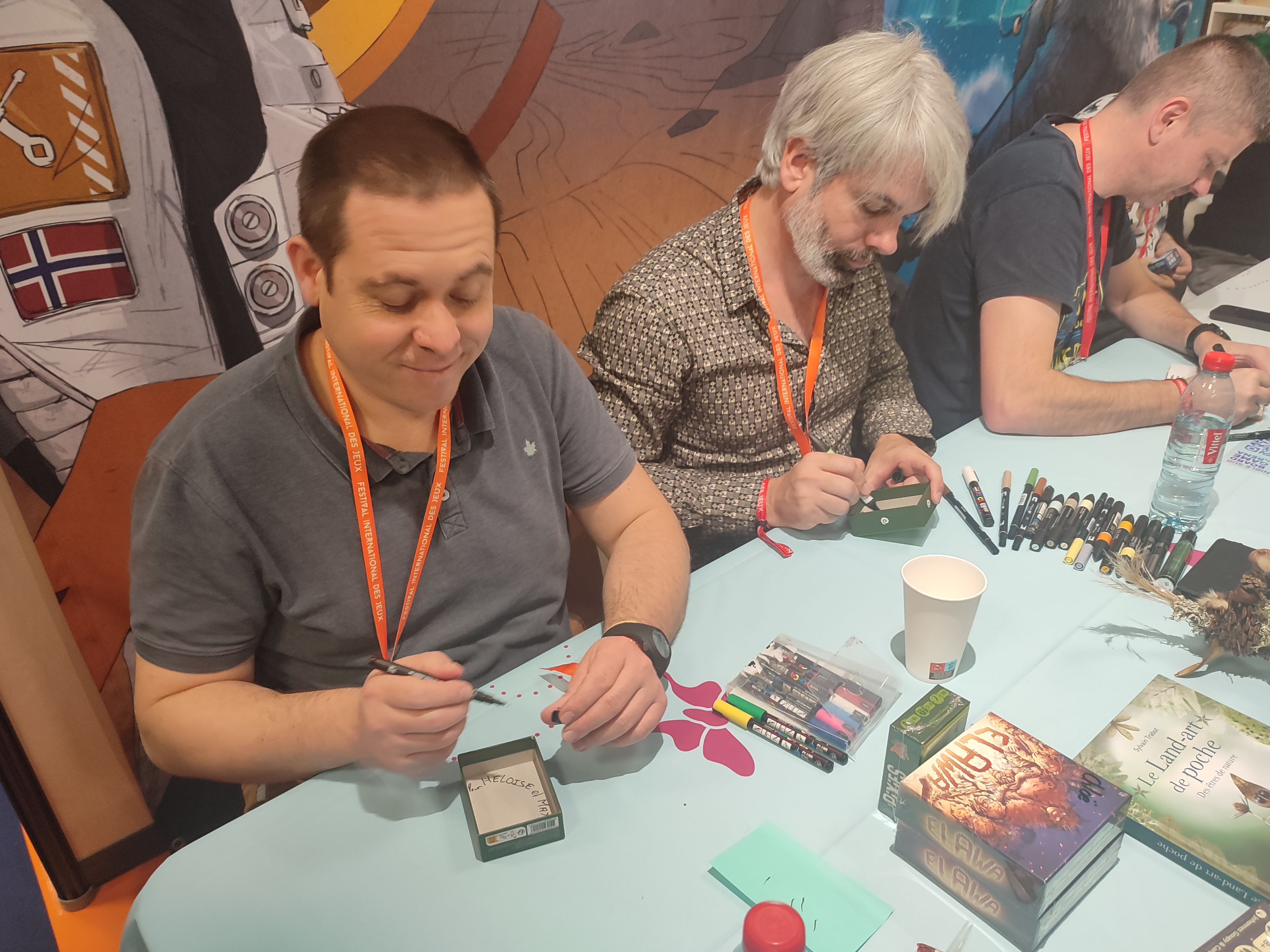 Et on redescends (!) chez Bombyx pour une dédicace de Pixies (Sold Out sur le stand) par l'auteur Johannes Goupy tout juste lauréat du jeu de l'année expert avec Far Away et Sylvain Trabut l'illustrateur.