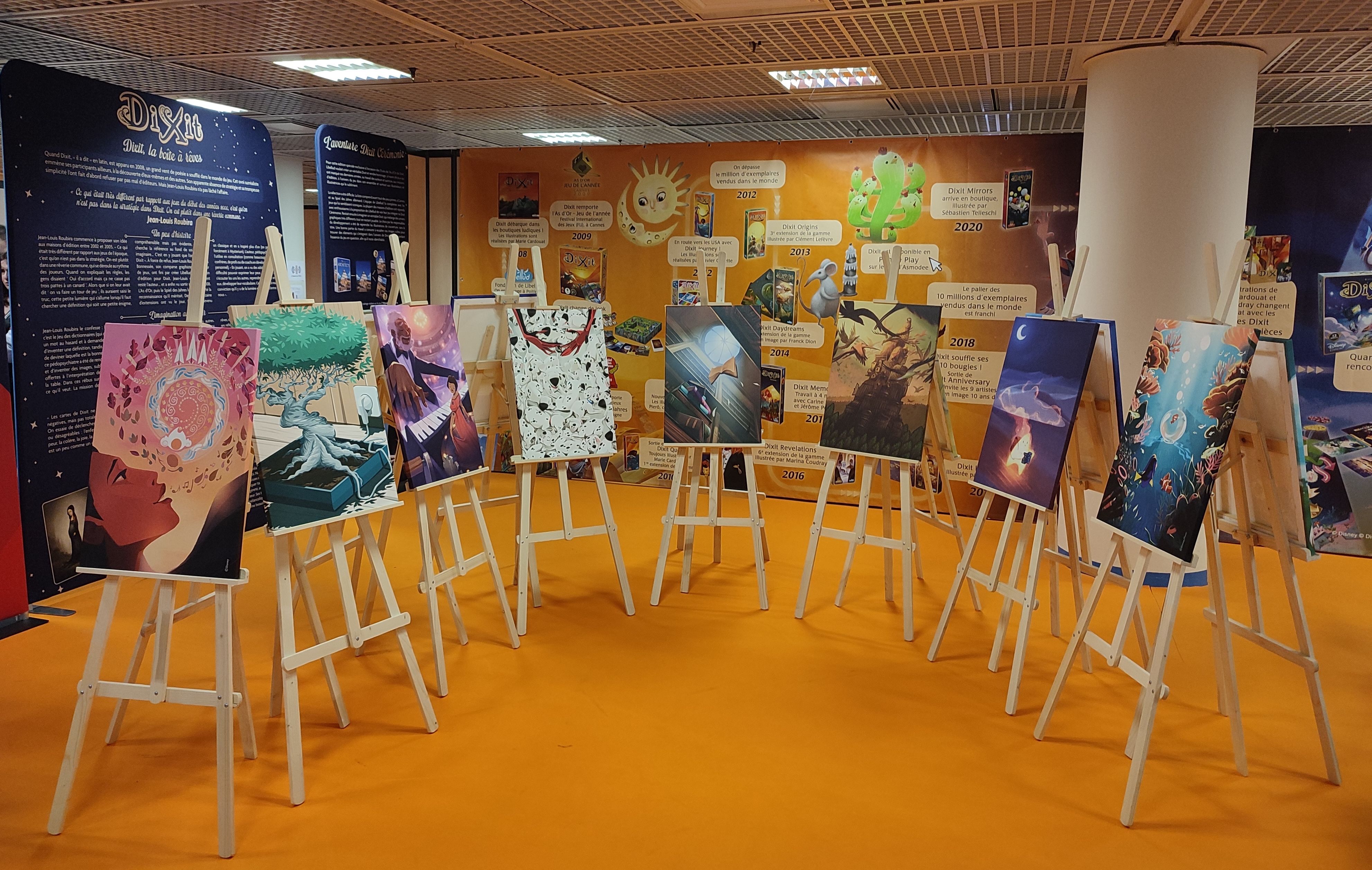 L'exposition met en avant l'histoire du jeu durant ses 15 années avec les extensions et les nouveaux jeux qui auront suivi le succès de DIXIT.