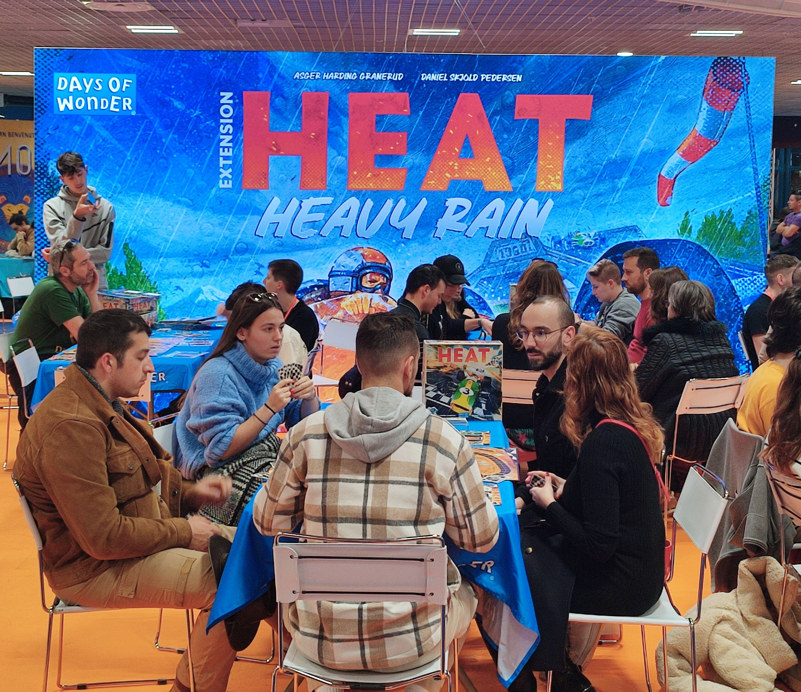 C'est bientôt l'heure du gong alors je remonte une dernière fois à l'étage chez Days Of Wonder où les tables de Heat sont pleines surtoiut celles pour découvir l'extension Heavy Rain.