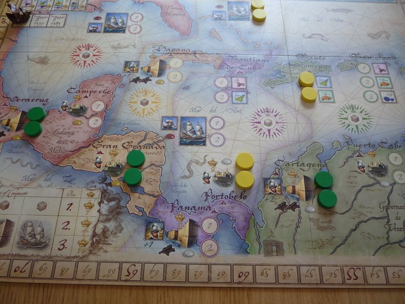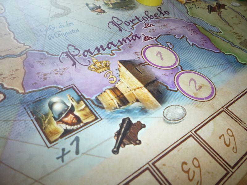 Et pour finir, il vous reste à fermer les forteresses. Cette fois ci, pas de dés à jeter. Vous devez passer en revue chaque zone. Dans chacune d'entre elles, il y a une seule ville et un seul fort. Si la ville a été bloquée, le fort reste libre. Par contre, si la ville n'a pas été bloquée, c'est le fort qui le sera. Par exemple, si Puerto Cabello et Gran Granada ont été bloquées, alors Panama et Veracruz seront également bloquées.