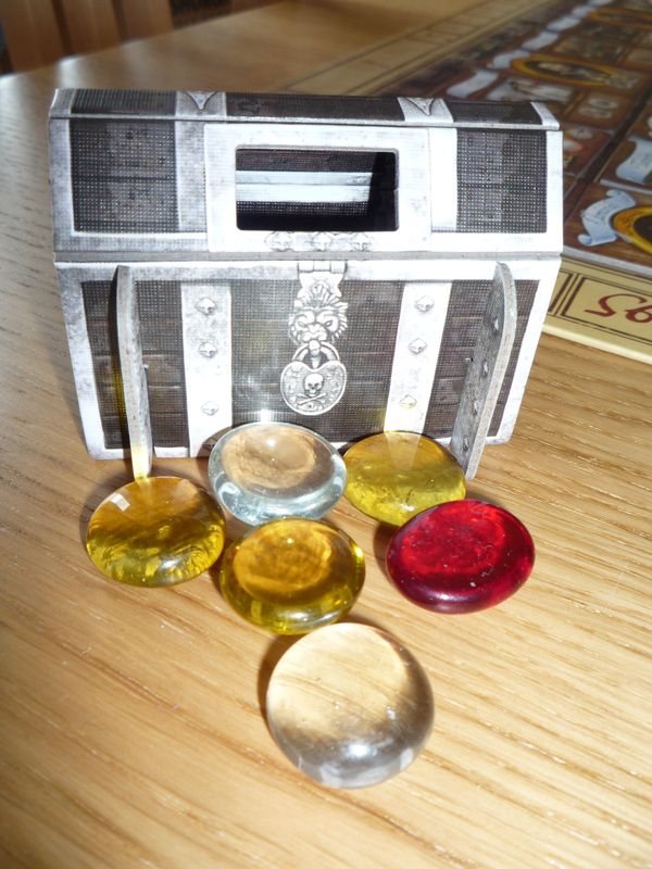 Vous devez également bloquer une partie de la carte, pour la deuxième phase. Cette étape sera répétée au début de chaque voyage (donc les trois manches du jeu se feront avec une carte différente). Pour ce faire, vous pouvez utiliser des disques de couleurs non utilisés. Vous allez donc bloquer un port marchand, un galion, deux villes et deux forts. La méthode utilisée est décrite un peu plus bas. Bien entendu, vous ne devez pas mettre les ressources disponibles dans les endroits bloqués.