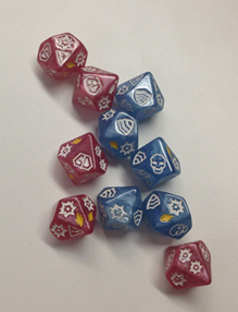 Les dés ont tous 10 faces et ont de multiples symboles sur chaque face permettant de grands nombres de combinaisons possibles sur un même lancer.