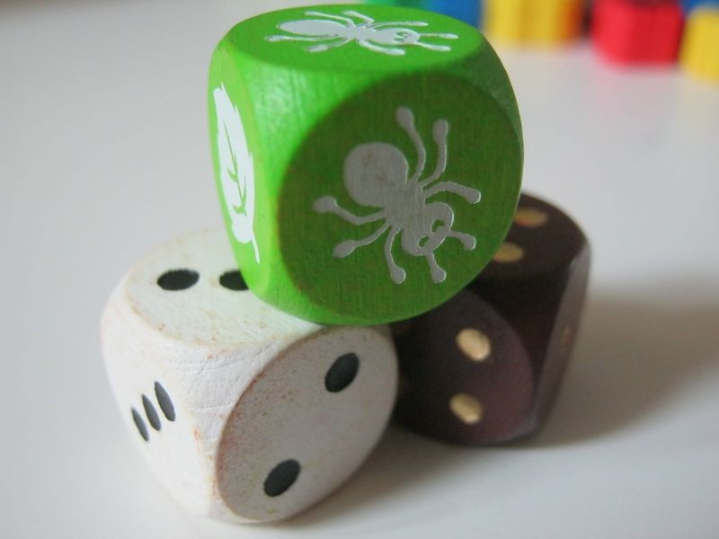 Le jeu comporte 3 dés : un blanc et un marron, classiques à point allant de 1 à 6, et un enfin un vert avec des symboles. Le dé vert possédant 3 symboles différents :