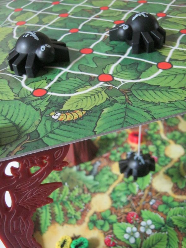 Depuis tout à l'heure je vous parle d'araignées, de toiles, de capture et surtout de suspension. Et c'est là que le jeu impressionne avec son matériel fort bien fait et immersif, et surtout qui donne une véritable originalité au jeu. En début de partie vous devrez encastrer aux quatre coins de la boite, quatre pylônes sur lesquels viendra se poser le plateau qui accueillera les araignées qui seront le pendant pondéral de l'araignée suspendue. Le tout maintenu par des aimants et séparé par le plateau. Il suffit de regarder la photo pour comprendre. Celles du dessus bougeant aussi celles qui se trouvent en dessous, lorsqu'elles se déplacent.
