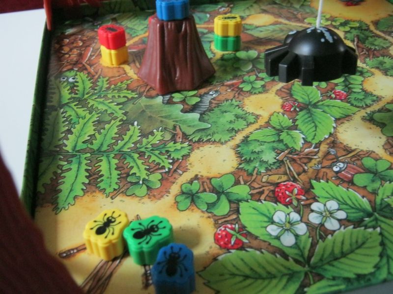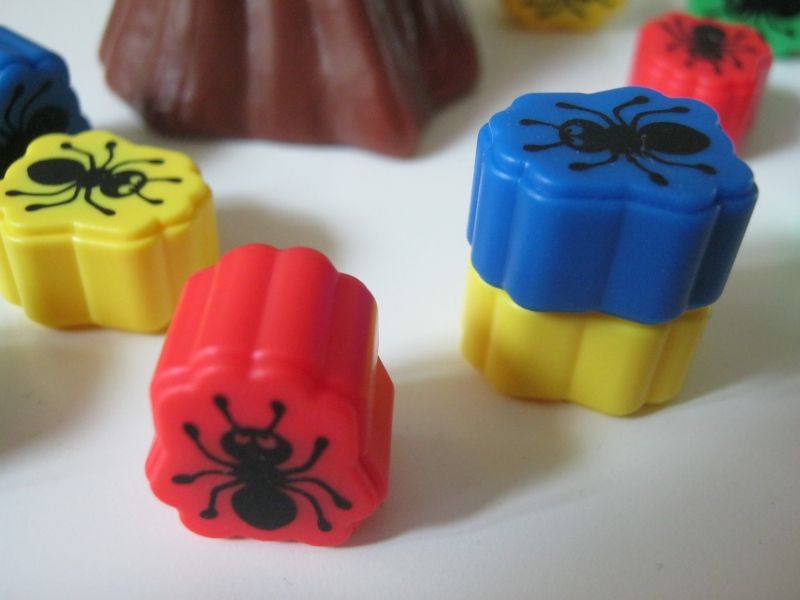 Les fourmis sont de quatre couleurs : rouge, bleue, verte et jaune. Toutes équipées d'un peu de métal pour pouvoir être capturées par la fameuse araignée. Autre élément à se déplacer sur le plateau : la souche en plastique sous laquelle viendront se cacher les fourmis.