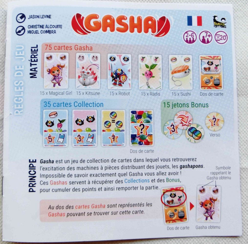 Gasha est un jeu de collection de Jason Levine et illustré par Christine Alcouffe et Miguel Coimbra. C'est un jeu pour 2 à 6 joueurs âgés de 7 ans et plus. Les parties sont courtes (20 minutes en moyenne) et s'enchaînent facilement.