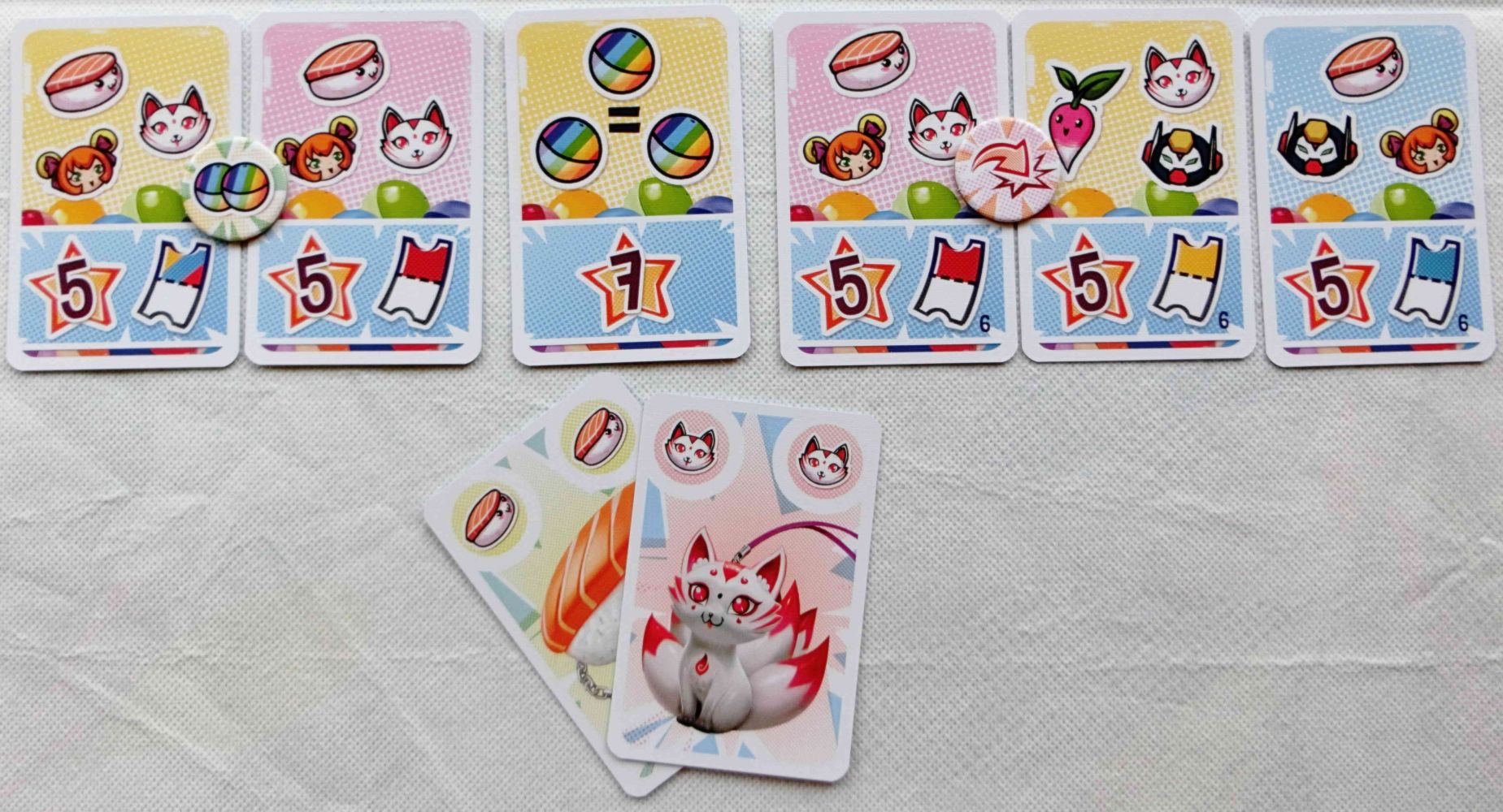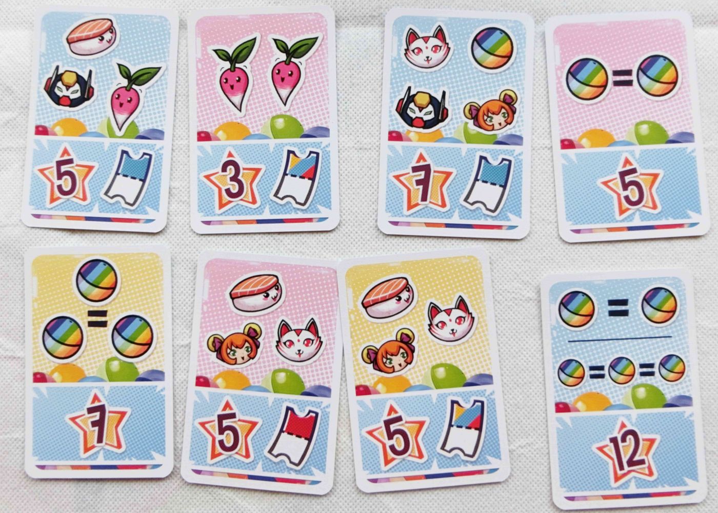 Les cartes Gasha ont 5 dessins différents : un renard, un robot un sushi, une princesse et un radis. Mais sur les dos des cartes sont représentés deux ou trois icônes les représentant. Quand vous piochez une carte, vous aurez en fait un indice de ce qu’elle cache mais vous n'aurez aucune certitude non plus.