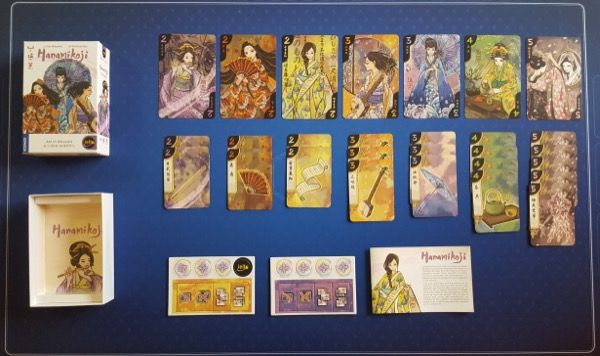 A l'ouverture de la boite on trouve 7 cartes Geisha (format sleeve80 x 122 mm), 8 jetons Action dont 4 orange et 4 violets, 7 jetosn Art et 21 cartes Objet (format sleeve 65 x 90 mm)dont 2 Flûte, 2 Eventail, 2 Papier, 3 Ombrelle, 3 Luth, 4 Service à thé, 5 Fleur.