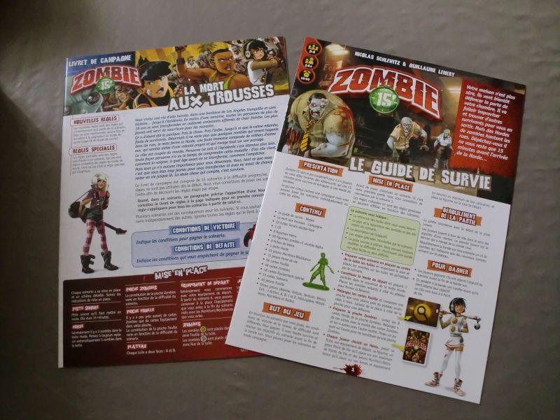 Une page représente un scénario, sur celle-ci vous retrouverez le paragraphe narratif, les conditions de victoire ou de défaite, la disposition des tuiles (marqués par un chiffre et une lettre par face), et enfin en dessous dans un encadré rouge les différents éléments dont vous allez avoir besoin pour jouer. Que ce soit les cartes objets, les cartes zombis et autres conditions particulières du terrain. Les deux premiers scénarios se jouent avec la face « prologue » des fiches personnages et avec un nombre restreint de zombies.